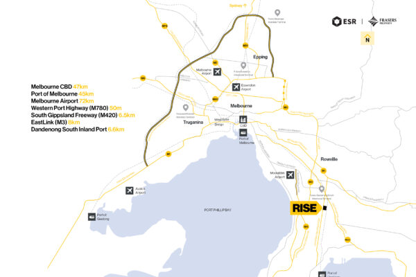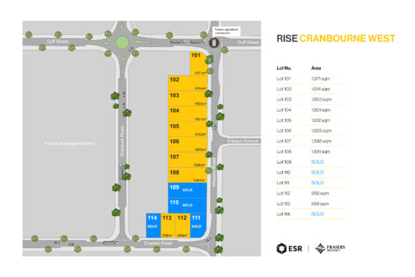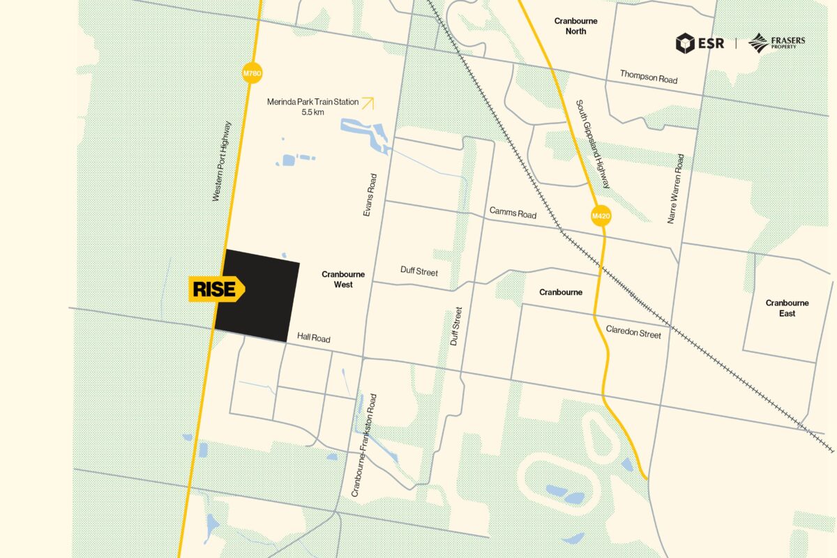 Located at 635 Hall Road, Cranbourne West, RISE Industrial Estate offers 14 premium industrial lots for sale via Private Treaty. RISE is delivered through the joint venture of ESR Australia & NZ and Frasers Property Industrial – two global leaders in industrial development. Their combined expertise ensures a world-class estate designed to meet the needs of modern businesses.
