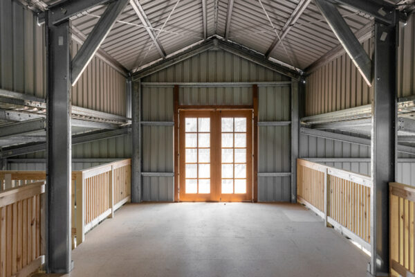 A large three-vehicle garage provides abundant space for vehicles, storage, or even a workshop setup.